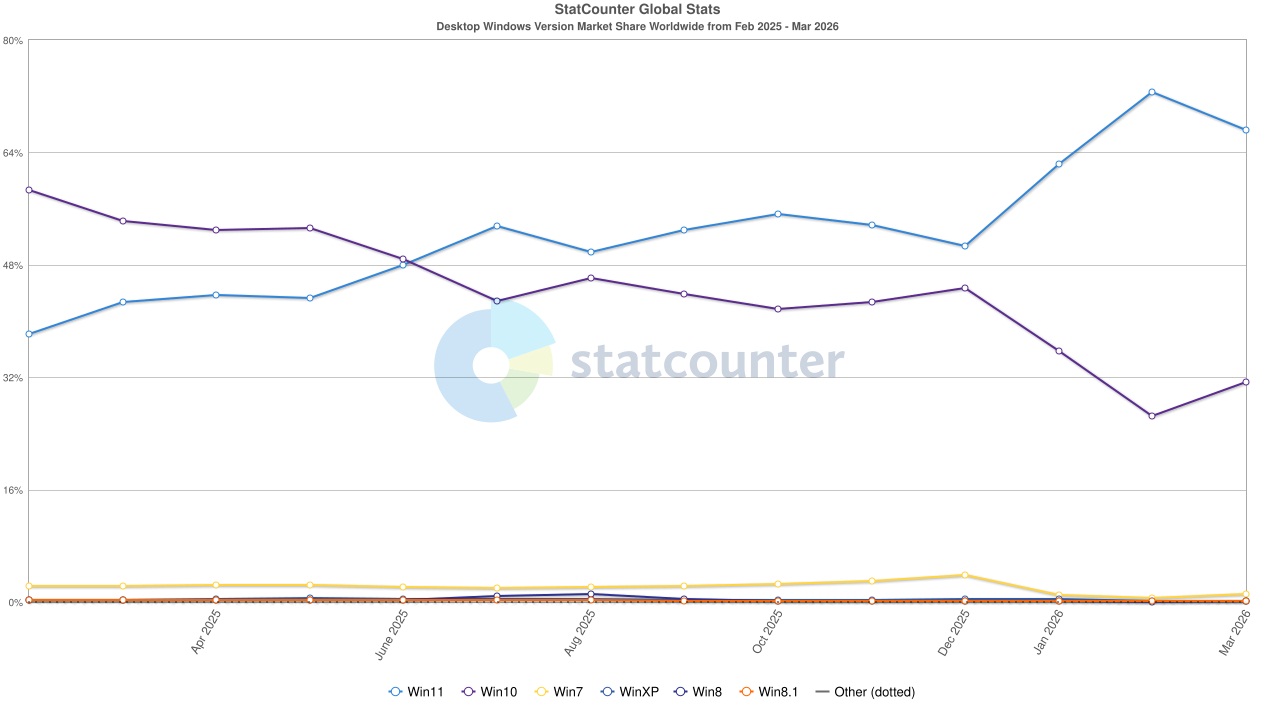 По данным Statcounter, в марте 2026 года доля Windows 10 увеличилась на 4,82 % в месячном выражении, достигнув показателя 31,27 %, тогда как Windows 11 за месяц утратила 5,43 % своих пользователей, в результате чего её доля снизилась до 67,14 %. На третьем месте по популярности среди ОС от Microsoft остаётся Windows 7, которой в марте отдали предпочтение 1,18 %.