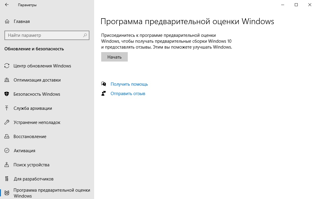 Для регистрации в программе тестирования в приложении «Параметры» перейдите в раздел Обновления и безопасность > Программы предварительной оценки Windows > Начать.