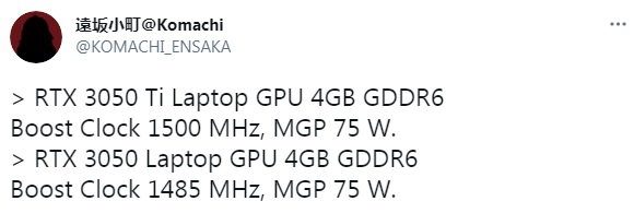 Согласно информации инсайдера, мобильная видеокарта GeForce RTX 3050 Ti получит графический процессор, способный функционировать на максимальной частоте в 1500 МГц, в то время как её младшая «соплеменница» обзаведётся чипом с частотой 1485 МГц в Boost-режиме — оба значения справедливы для теплопакета в 75 Вт. Кроме того, источник сообщает, что обе новинки смогут располагать 4 Гбайт видеопамяти типа GDDR6.