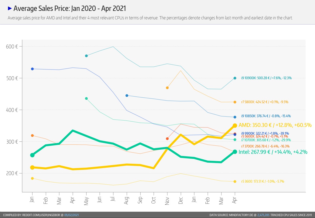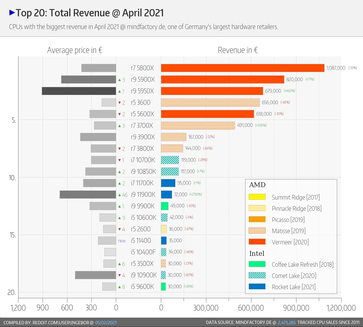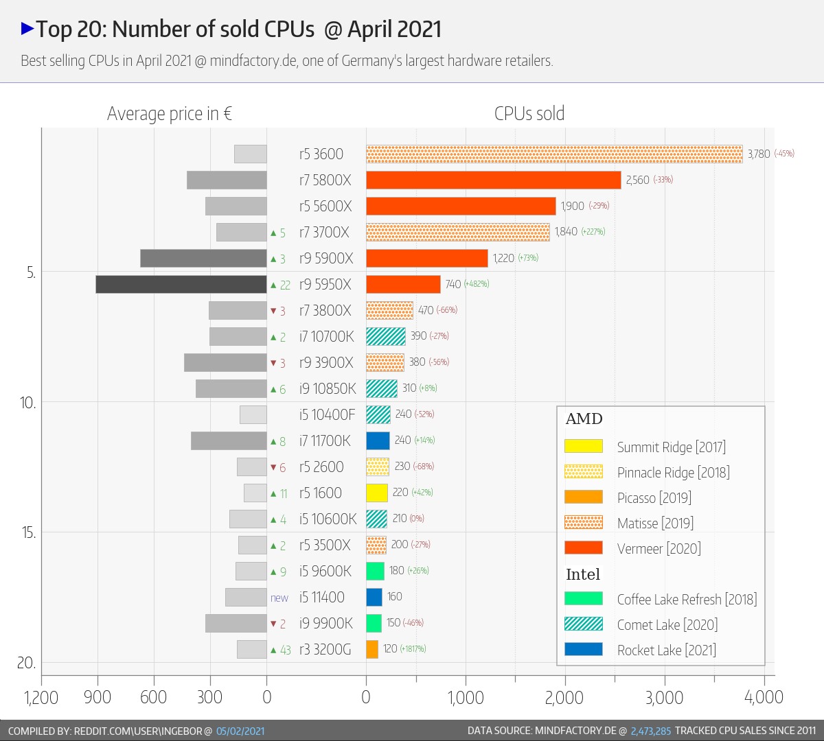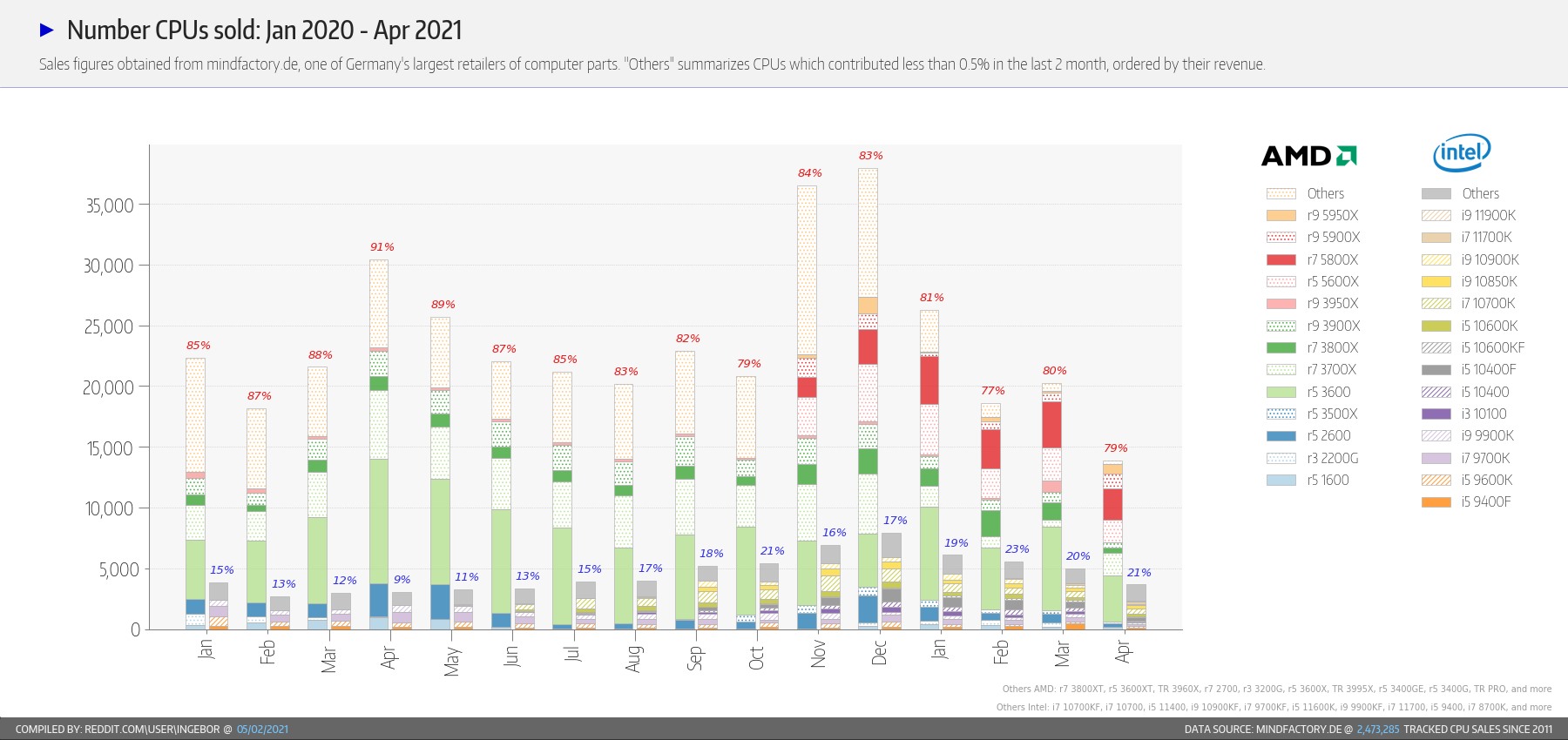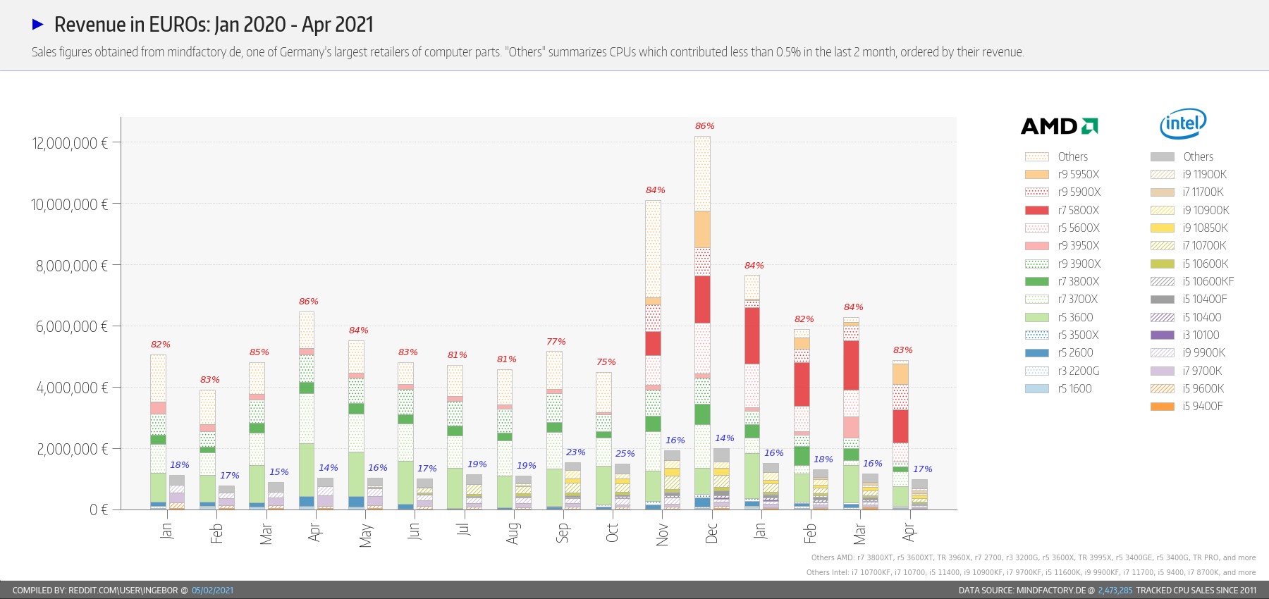 Начало мая принесло очередную порцию данных, собранных на основе статистики продаж крупного немецкого ритейлера Mindfactory, которой делится с широкой общественностью энтузиаст, известный под ником ingebor.