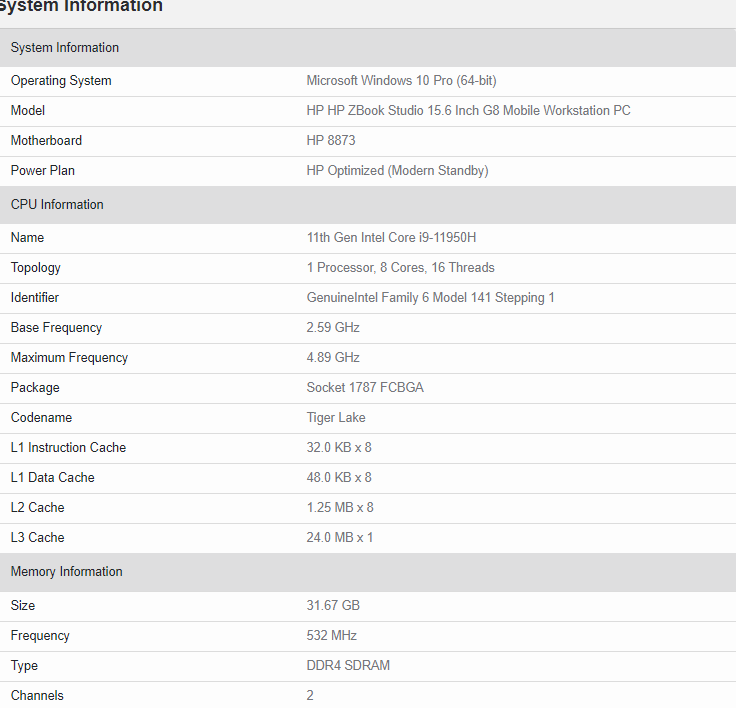Процессор Intel Core i9-11950 никогда не появлялся в утечках, поэтому было удивительно увидеть результаты тестов 15,6-дюймового ноутбука HP ZBook Studio G8 на базе этого процессора в Geekbench 5. Чип имеет восемь ядер, основанных на микроархитектуре Willow Cove и работает на частоте от 2,6 до 4,9 ГГц он оснащен кэш-памятью 24 МБ, двухканальным контроллером памяти DDR4-3200 и графическим ядром UHD с архитектурой Xe.