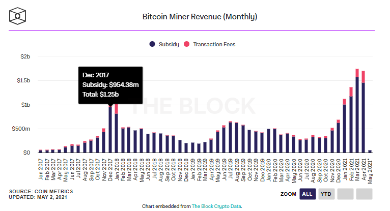 Согласно данным The Block, апрель стал одним из самых лучших месяцев в истории криптодобычи. Так, общий доход всех майнеров Биткоина составил 1.7 миллиарда доллара, что уступает только показателям марта, когда эта цифра была зафиксирована на отметке в 1.75 миллиарда. Драйвером роста была высокая цена на Биткоин, когда он стоил немногим меньше 65 тысяч долларов, а также крайне высокая среднемесячная цена. Последнее было обусловлено незначительными перепадами и относительной стабильностью, когда криптовалюта опускалась на несколько дней.