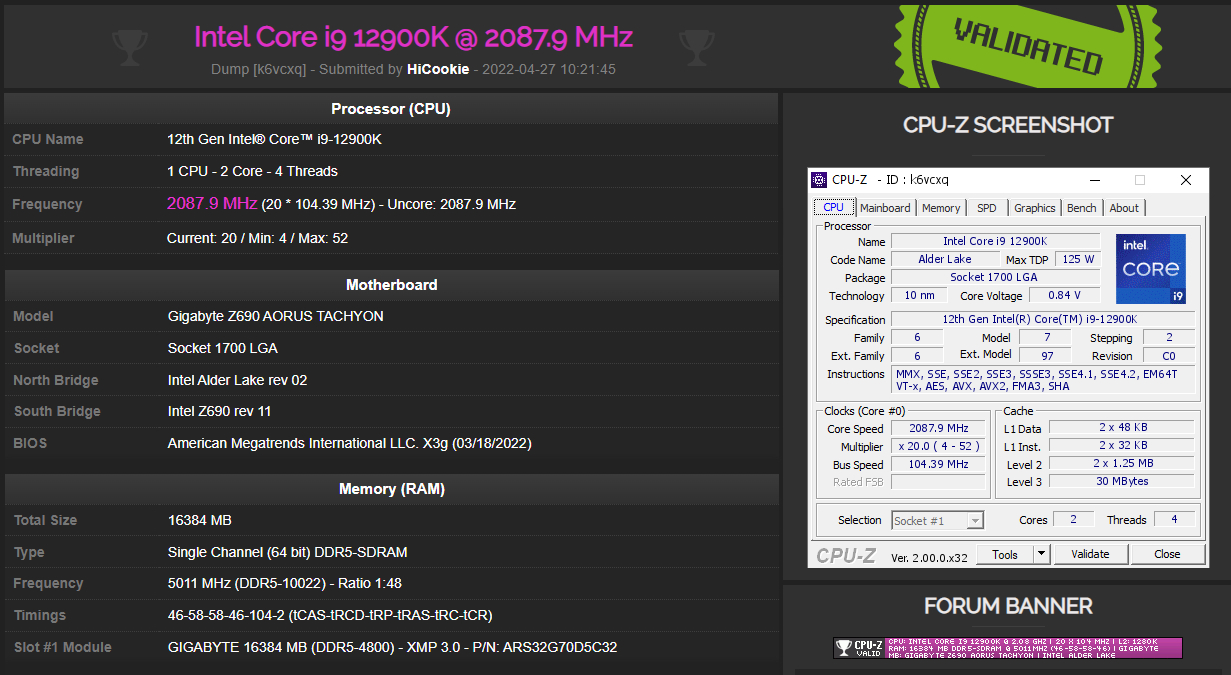 Фактически, как поясняет автор рекордов, использовались два экземпляра Intel Core i9-12900K с достаточно высоким критерием «отборности» (SP85 и SP93 по шкале ASUS ROG), которые устанавливались в материнские платы ASUS ROG TUF Gaming Z690-Plus WiFi D4 и ASUS ROG Maximus Z690 Apex. В зависимости от конфигурации стенда, процессор охлаждался либо системой фазового перехода, либо так называемым чиллером, к которому был подключен процессорный водоблок. В первом случае температуру удавалось опустить до минус 52 градусов по Цельсию, во втором – до плюс трёх градусов. В дальнейшие планы энтузиаста входит обновление серии рекордов для GeForce GTX 1650 (GDDR5).
