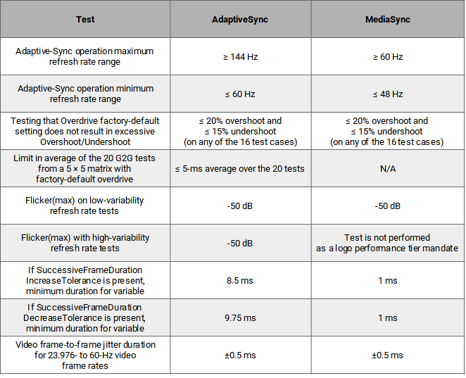 Программы VESA AdaptiveSync Display и MediaSync Display удовлетворяют потребность в измерении уровня производительности или качества поддержки Adaptive-Sync, маркировка позволит потребителям легко различать дисплеи разного класса и определять их характеристики. Сертификация по этим стандартам также требует сертификации и по стандарту VESA DisplayPort.