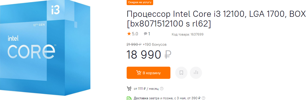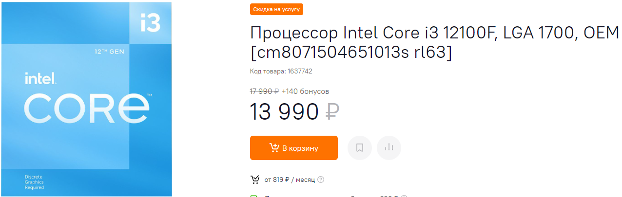 За 14 000 рублей есть Core i3-12100F. Увы, перед нами ОЕМ поставка, в которое нет кулера. А теперь оцените выгоду: обычная модель Core i3-12100 с кулером стоит 19 тысяч. Core i3-12100F – на 5 тысяч дешевле. Вы покупаете более выгодный вариант, а к нему кулер за 1000 рублей. Чистая выгода в 4000 рублей на пустом месте. Вы уже догадались, что здесь нет интегрированного графического ядра, но ведь перед нами пусть и недорогой, но игровой камень.