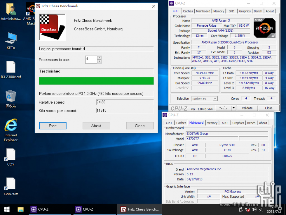 Теперь непосредственно к тестам. Новый процессор был протестирован участником китайского форума ChipHell в Cinebench R15, Fitz Chess Bench., а также во встроенном бенчмарке CPU-Z. Для прохождения 'бенчей' 4-ядерник был разогнан до 4265 и 4314 Мгц соответственно. Результаты тестов (как это ни удивительно) представлены на скриншотах ниже.