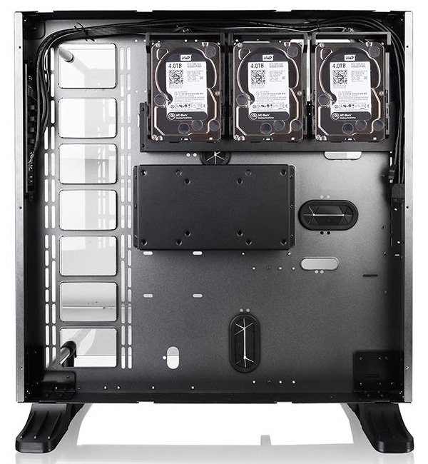 Жёсткие диски располагаются за поддоном материнской платы, можно установить до 6 3,5" или 2,5" накопителей. Цена новинки составляет €172.