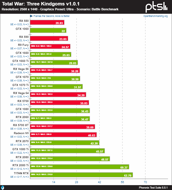 Итак, давайте перечислим участников тестирования: GTX 1060, GTX 1070, GTX 1070 Ti, GTX 1080, GTX 1080 Ti, GTX 1660, GTX 1660 Ti, RTX 2060, RTX 2070, RTX 2080, RTX 2080 Ti, TITAN RTX, R9 Fury, RX 580, RX 590, RX Vega 56, RX Vega 64, Radeon VII, RX 5700 и RX 5700 XT. Для тестирования игры Total War: Three Kingdoms был использован компьютер на базе процессора Intel Core i9 9900K под управлением Ubuntu 19.04 с ядром Linux 5.3 Git.