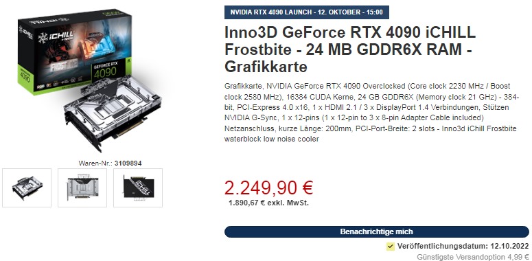 Её «соплеменница», Inno3D GeForce RTX 4090 iCHILL Frostbite, основанная на графическом чипе с аналогичными частотными характеристиками и оснащённая водоблоком, отличающимся большей эффективностью и рядом оптимизаций по сравнению с моделями GeForce RTX 30, с медным никелированным основанием, стильной прозрачной крышкой, дополненной красочной RGB-подсветкой, и бэкплейтом усиленной конструкции, предлагается за €2250 (примерно 129 000 рублей). Стоит заметить, что цены приведены с учётом НДС.