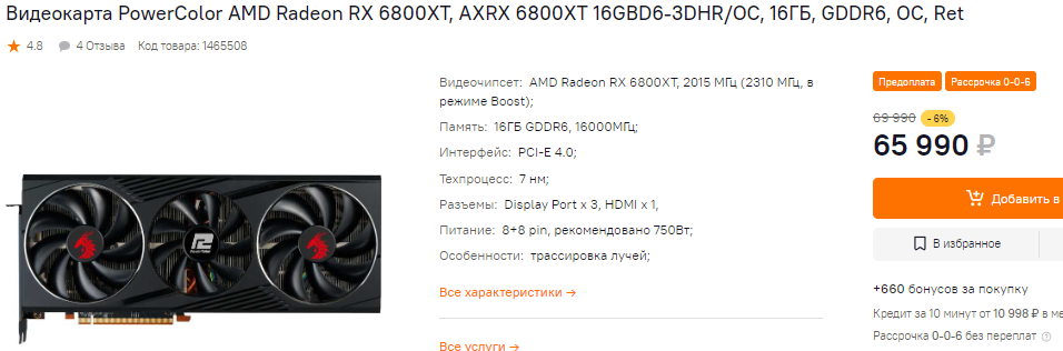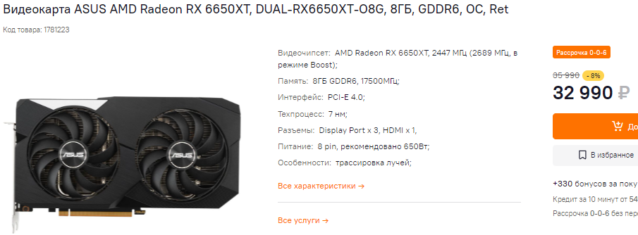 В последние дни ощутимо подешевела и Radeon RX 6650 XT. Эта видеокарта с первых дней имела преимущества перед конкурентами по соотношению количества кадров в секунду в реальных играх и цены. Ну а сегодня она стоит всего 33 тысяч. Во многих играх Radeon RX 6650 XT догоняет более дорогую GeForce RTX 3060 Ti, но имеет важное преимущество. Так, если вы хотите увеличить потенциал своего старого компьютера за счёт смены видеокарты, то с RX 6650 XT сделать это легко и просто, ведь вам не потребуется смена блока питания. А вот GeForce RTX 3060 Ti на блоки питания мощностью меньше 550 Вт не заведётся.