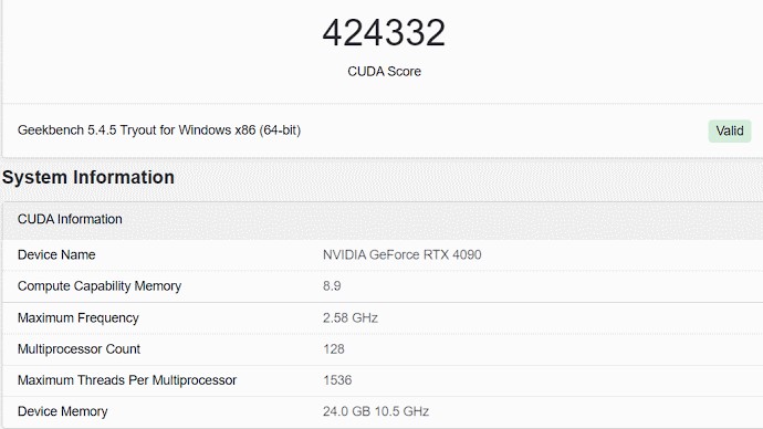 Сегодняшняя утечка произошла благодаря боту Benchleaks в Twitter. Кто-то с ASRock X670E Taichi Carrera и Ryzen 9 7950X добавил в ПК GeForce RTX 4090 и запустил вычислительный тест Geekbench с использованием CUDA. Он сделал это как минимум дважды, и оба результата были очень близки, с максимальной производительностью 424 332 балла.