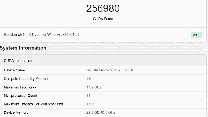 Беглый просмотр базы данных Geekbench находит ниже результат для GeForce RTX 3090 Ti: