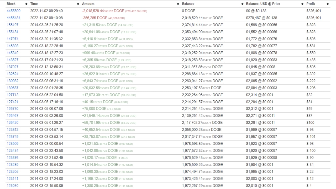 Сегодня в сети Dogecoin был совершен вывод более 2,37 млн DOGE с адреса, бездействовавшего в течение почти 9 лет. В период с 23 декабря 2013 по 25 марта 2014 его владелец осуществил более 400 транзакций пополнения криптовалютного счета. Стоимость одного DOGE на тот момент варьировалась от 0,0002272$ до 0,001592$, и в среднем составляла 0,001$.