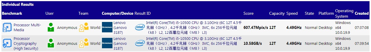 Исходя из имеющихся данных, процессор Intel Core i5-10500 располагает 6 ядрами с поддержкой технологии гиперпоточности (Hyper-Threading), функционирующими на базовой частоте 3,1 ГГц с повышением до 4,5 ГГц в максимальном режиме. В мультимедийном тесте процессора (Processor Multi-Media) новинка продемонстрировала результат 607.47 Mpix/s, а в дисциплине, измеряющей уровень производительности криптографических вычислений (Processor Cryptography (High Security)), достижения CPU составили 10.58 GB/s. Таким образом, представленная модель уступила своему 6-ядерному 12-поточному конкуренту в лице AMD Ryzen 5 3600X в среднем 4,6 % и 32,6 % соответственно.