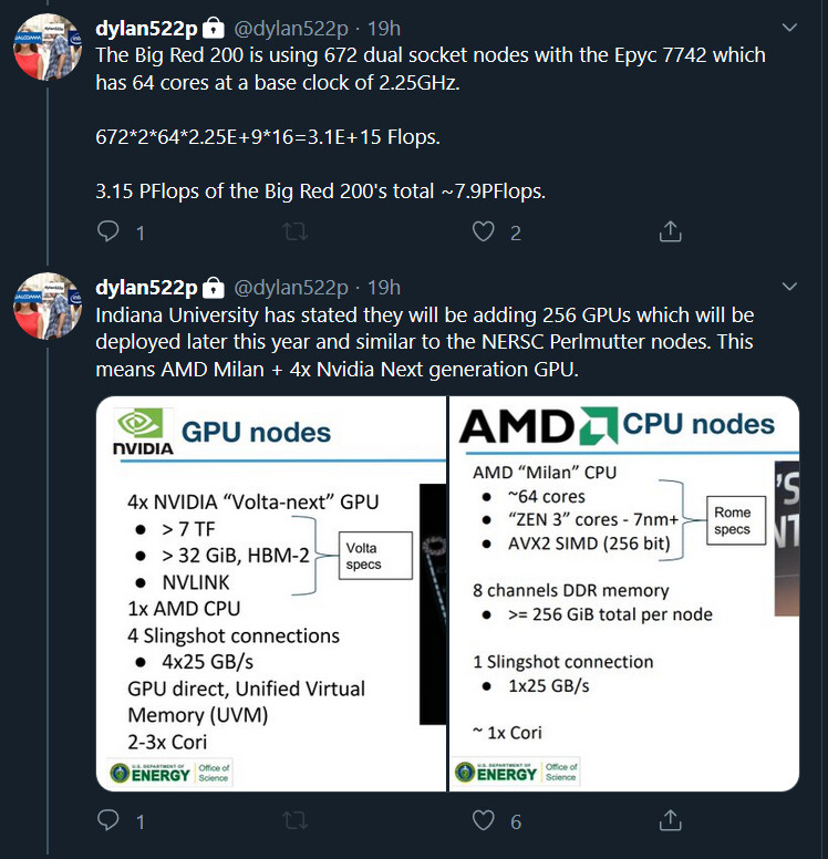 Путём несложных подсчётов энтузиасты выяснили, сколько узлов планируется разместить на суперкомпьютере. Приняли в расчёт показатели процессора AMD EPYC 7742 Rome, а также точное количество видеокарт, которые будут закуплены. В конце концов уже известны конечные показатели производительности Big Red 200. В итоге оказалось, что максимальная мощность новой видеокарты Ampere на 7-нм техпроцессе будет всего 18 TFLOPS, что не более чем 30% быстрее показателей GeForce RTX 2080 Ti, мощность которой достигает 14 TFLOPS.