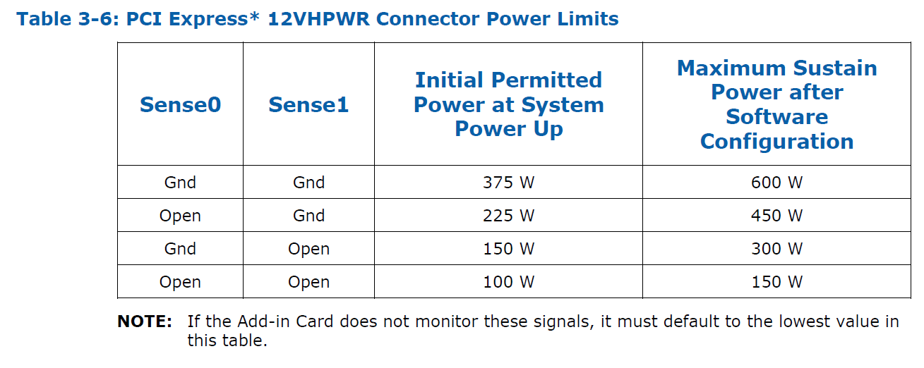 Также ресурс со ссылкой на фрагменты документа «Руководство по проектированию ATX версии 3.0» сообщает, что кабели 12VHPWR могут выпускаться в различных исполнениях для передачи от 150 до 600 Вт энергии — кабели должны иметь соответствующую маркировку. Таблица показывает, как мощность зависит от того, используются ли дополнительные сигнальные контакты, сейчас предполагается использовать только два из четырёх: Sense0 и Sense1. Так если они не задействованы, по кабелю можно передавать до 150 Вт, если задействован один из двух сигнальных контактов, то возможна передача до 300 или 450 Вт, а если оба контакта, то до 600 Вт.