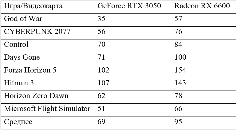 Именно для них мы предлагаем выбрать наиболее актуальную и недорогую видеокарту начала весны. На самом деле "недорогую" – это явный перебор. В левом углу ринга GeForce RTX 3050. Как вы знаете она стоит 75 000 рублей. В правом углу ринга – Radeon RX 6600. Это крайне удачная модель, которая даже после роста цен стоит 62 000 рублей. Логично было бы предположить, что именно Radeon RX 6600 является аутсайдером и уступает по производительности видеокарте производства NVIDIA. Давайте это выясним. Ниже находится таблица с результатами, составленная по данным тестирования команды Testing Games. Они решили выяснить, какая из видеокарт является наиболее интересной и выгодной для покупки.
