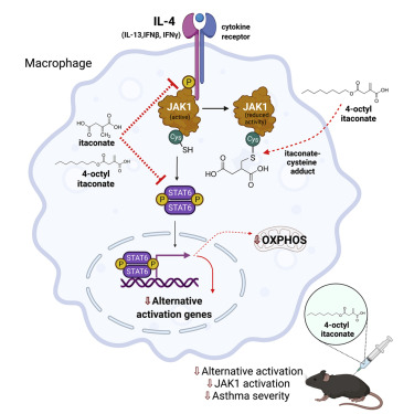 Исследователи протестировали производное итаконата под названием 4-OI на мышиных моделях с тяжелыми формами астмы, которые не реагируют на обычное противовоспалительное стероидное лечение. Было обнаружено, что молекула снижает активацию JAK1 и уменьшает тяжесть астмы у мышей.