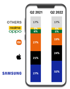 Речь идёт о втором квартале 2022 года. Если сравнивать этот период с прошлогодними показателями, в 2022 году продажи упали на 20%. На китайском рынке спрос значительно сократился, что и привело к такой ситуации. Но нужно отметить, что Apple и Samsung смогли увеличить продажи.