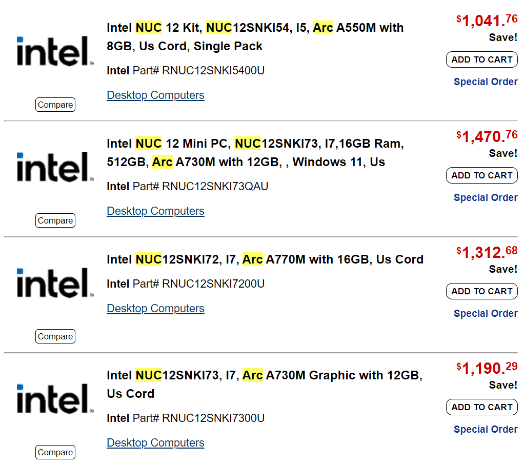 NUC 12 Serpent Canyon будет доступен по цене от 1042 до 1471 долларов , но это всего лишь четыре разные конфигурации из множества вариантов процессоров Core i5 и Core i7. Вполне вероятно, что эта цена может быть не окончательной и является только заполнителем на странице продукта. Но это также означает, что запуск уже близок, так как информация в розничных магазинах обычно появляется за недели до запуска.