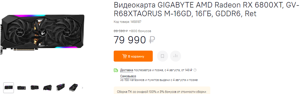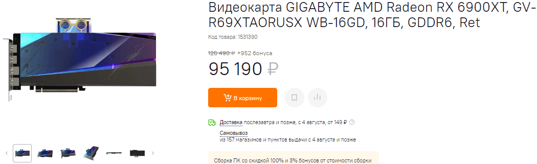 Несмотря на то, что на момент релиза Radeon RX 6900 XT получил рекомендованную цену 999 долларов, в Россию он приехал за 93 тысячи рублей. Сегодня, модель производства GIGABYTE доступна за 95 тысяч, вот только мы хотим обратить ваше внимание, что здесь уже всё готово для подключения внешнего контура с системой жидкостного охлаждения. Получается, что за рекомендованную сумму вы сможете получить гораздо более мощную видеокарту. Надо брать!