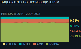 В общем, количество пользователей, играющих на видеокартах Nvidia, составило 76,19%. 14,64% у AMD и 8,96% у Intel.