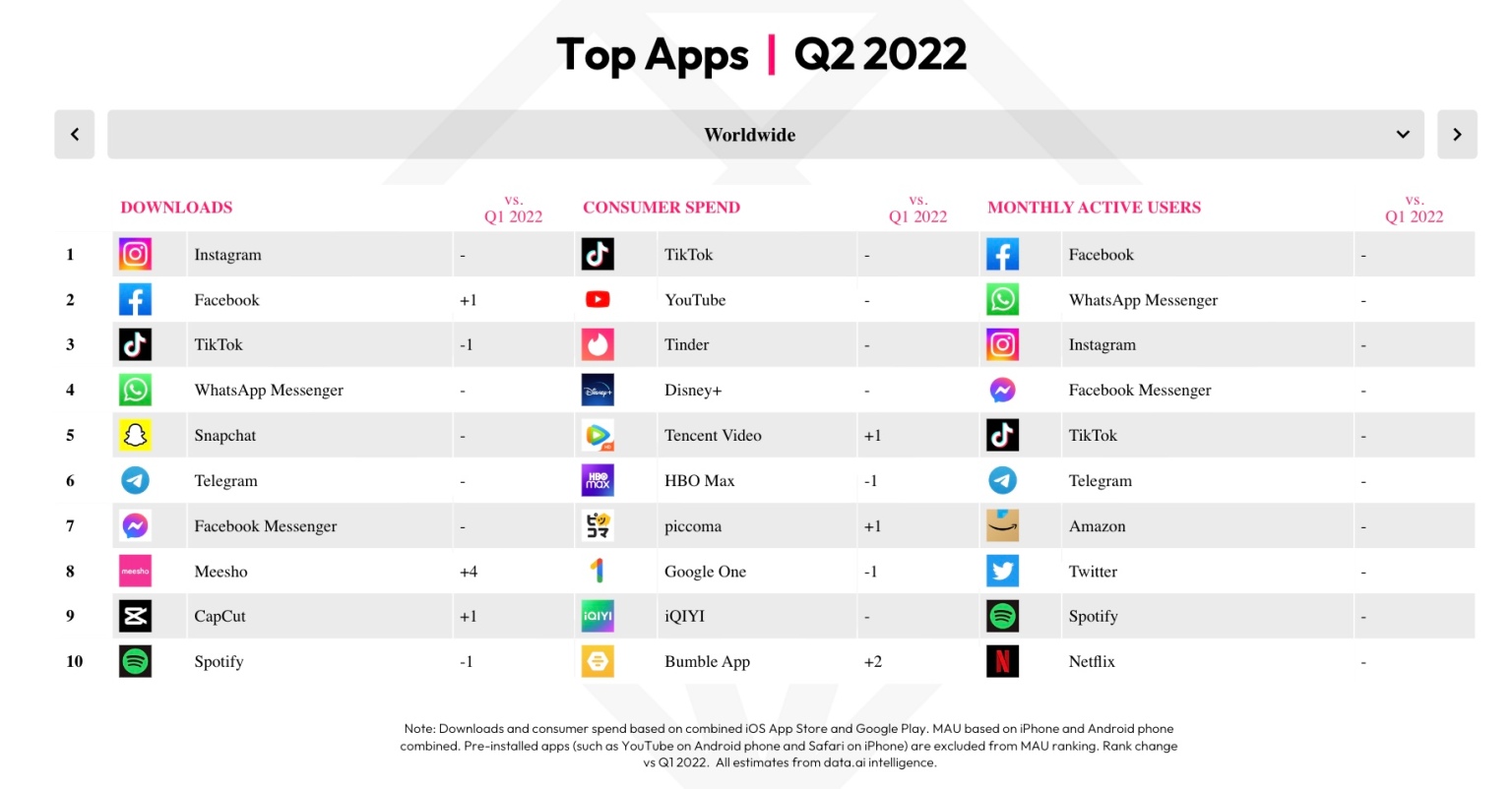 Вдобавок специалисты data.ai опубликовали список самых скачиваемых приложений. Здесь TikTok уступил Facebook* и Instagram*. Топ приложений с самым большим числом пользователей остался неизменным по сравнению с первым кварталом 2022 года.
