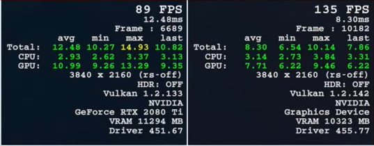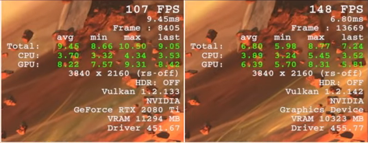 NVIDIA GeForce RTX 3080 в среднем показала около 120 кадров в секунду на сценах с простым действием, а в некоторых случаях RTX 3080 была примерно на 70-80% быстрее RTX 2080 Ti. Максимальный FPS, достигнутый GeForce RTX 3080 составляет около 160-170 FPS тогда, как GeForce RTX 2080 Ti максимально выдает только около 110-120 FPS.