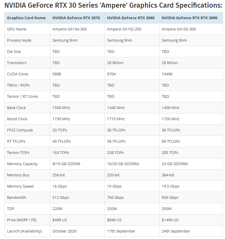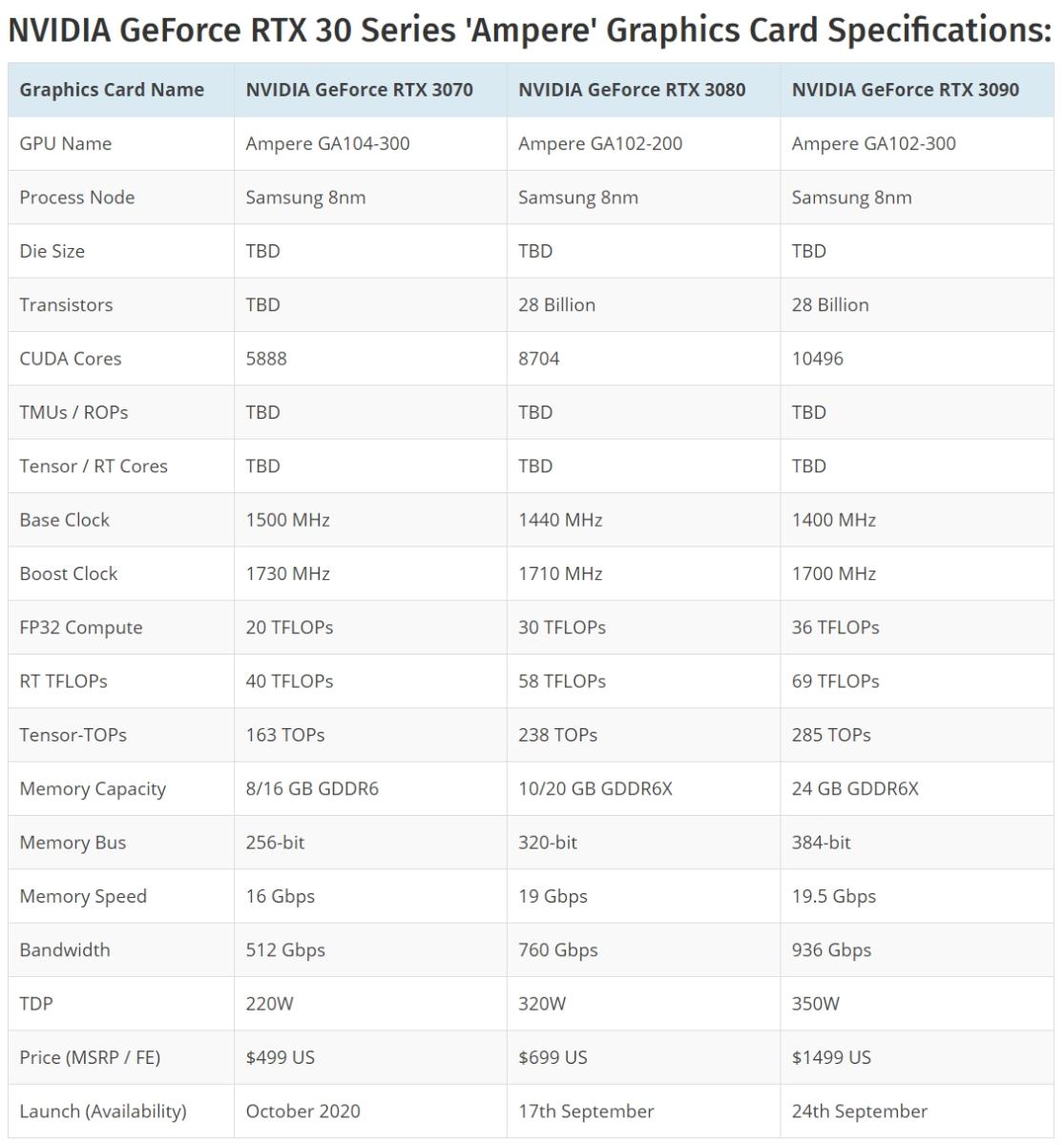 Шокирующим стало количество CUDA-ядер, которое по непонятным причинам удвоилось. За несколько дней до анонса некоторые партнеры NVIDIA опубликовали характеристики своих графических решений, в которых подтверждалась ранняя информация о 5248 и 4352 CUDA-ядрах в графических чипах RTX 3090 и RTX 3080. Но в официальных характеристиках количество CUDA-ядер составляло 10496 и 8704. Несмотря на большое количество новостей от инсайдеров, лишь немногие вспомнили о том, что задолго до анонса озвучивал известный инсайдер @kopite7kimi и @KittyYYuko.