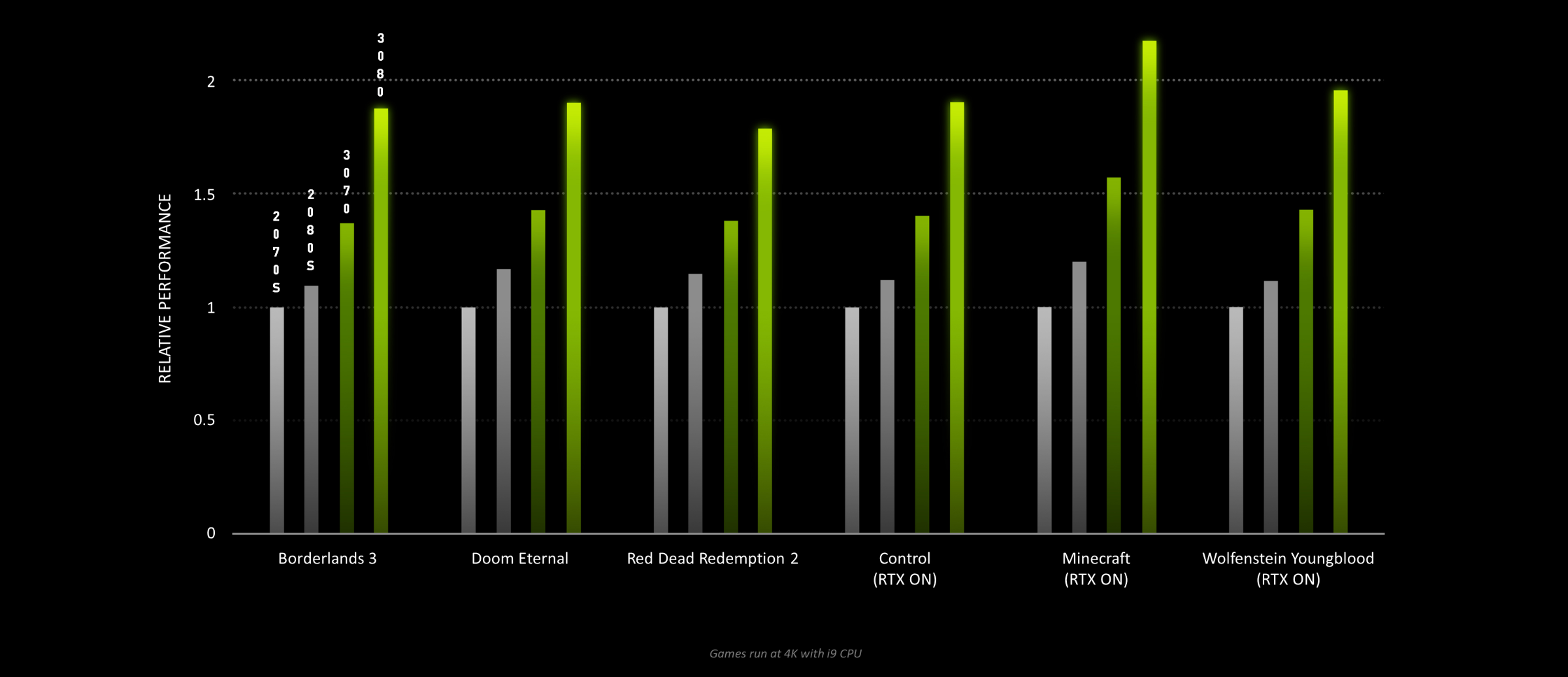 NVIDIA опубликовала официальное новое сравнение производительности своей видеокарты GeForce RTX 3080 с флагманом предыдущего поколения GeForce RTX 2080 Ti в разрешении 4K. Сравнение проводилось на игре Doom Eternal с настройками Ultra Nightmare и при этом GeForce RTX 3080 показала потрясающую производительность за свои деньги перед флагманом Turing.