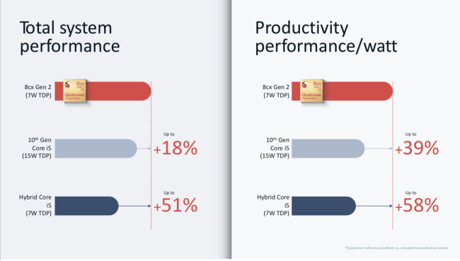 Qualcomm утверждает, что чип обладает TDP 7 Вт и обеспечивает на 18% более высокую производительность системы, чем процессор Intel Core i5 поколения Ice Lake, и на 51% больше, чем у Intel Core i5 Lakefield с TDP 7 Вт. Компания Qualcomm также заявила, что новый чип Snapdragon предлагает до 39% больше производительности на ватт, чем Intel Core i5 10-го поколения, и на 58% больше, чем Core i5 Lakefield. Компания не представила никаких конкретных спецификаций, включая тактовую частоту или количество ядер и потоков.