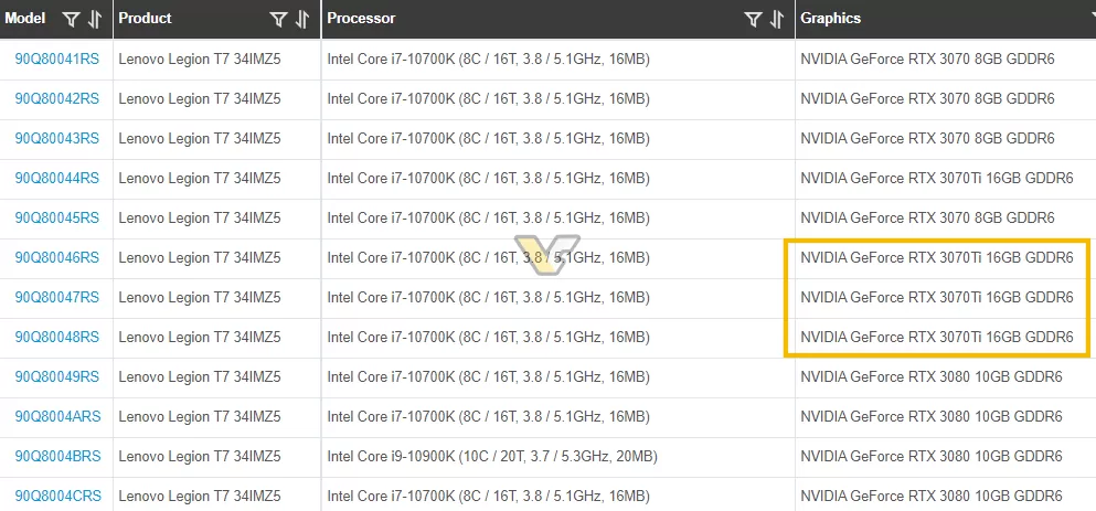 На сайте компании со справочными спецификациями продуктов было несколько записей для систем с неанонсированной картой RTX 3070 Ti, укомплектованной 16 ГБ памяти стандарта GDDR6, что вдвое больше, чем у стандартной RTX 3070 и больше, чем 10 Гб у RTX 3080. Однако вскоре после утечки Lenovo удалила упоминание видеокарты RTX 3070 Ti.