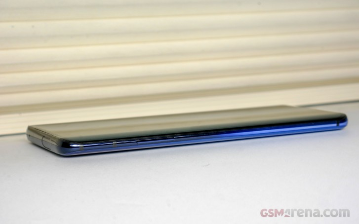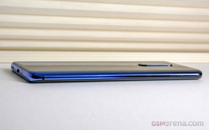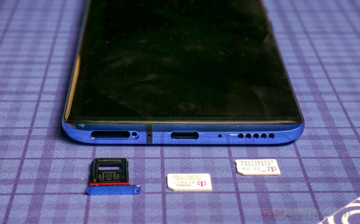 Верхний отступ на лицевой стороне содержит набор сенсоров, объектив фронтальной камеры с 8-мегапиксельныйм датчиком изображения и один из двух стереофонических динамиков. Второй вынесен на нижней торец, где ему компанию составляют ещё два важных компонента: отверстие микрофона и порт USB-C. 3,5-миллиметрового выхода в смартфоне нет. Качество звука находится примерно на одном уровне с Samsung Galaxy S10e и OnePlus 7.