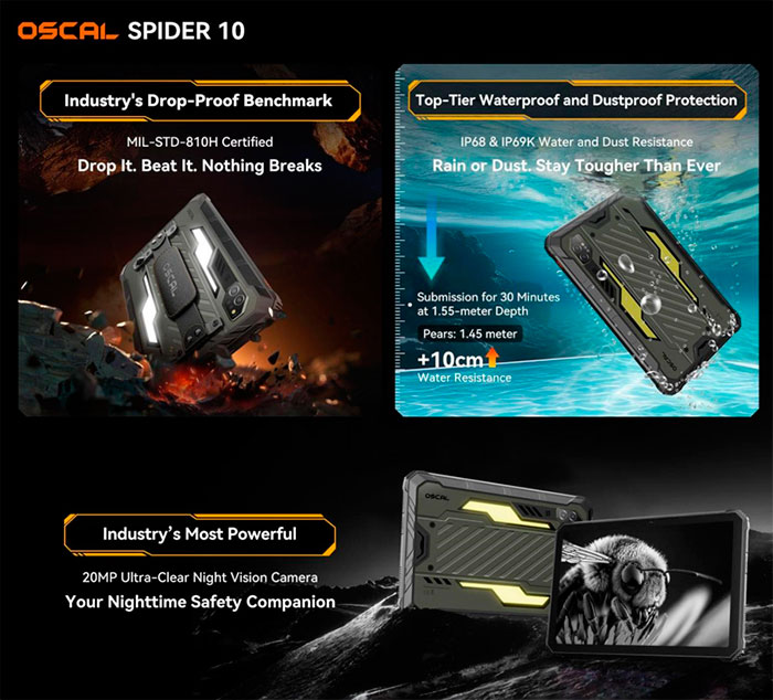 Если вы часто отправляетесь в рабочие поездки или на срочные ночные задания, вам может потребоваться надёжный планшет с возможностью освещать путь, очень долго работать без зарядки и поддерживать ночное видение. Таким является флагманский защищённый планшет OSCAL SPIDER 10.