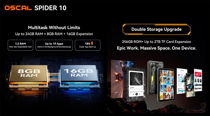 SPIDER 10 получил хранилище объёмом 256 ГБ, что вдвое превосходит объём в большинстве защищённых мобильных устройств. Есть поддержка карт памяти формата TF вместимостью до 2 ТБ, благодаря чему упрощается работа с большими файлами, такими как строительные чертежи, инженерные отчёты и данные полевых исследований. За счёт технологий Atomized Memory 2.0, интеллектуальной предварительной загрузки и управления с низким потребления памяти планшет функционирует плавно, эффективно и надёжно где угодно.