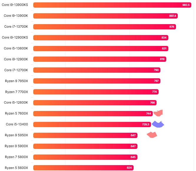 Intel со своей серией Raptor Lake нанесла имиджевый ущерб новому поколению процессоров AMD, ведь Core i9-13900K банально быстрее Ryzen 9 7950Х в большинстве задач. Но особенно впечатляет работа синих камней в задачах, ориентированных на одно ядро. Здесь отставание красных доказывает, что Лиза Су переоценила архитектуру Zen 4, а низкие продажи новинок – это лишь начало. Похоже, окончательно подорвать позиции Ryzen 7000 поручено младшим процессорам линейки Raptor Lake, которые поступят в продажу в январе 2023 года и будут представлены на CES 2023. В прессу просочились тесты бюджетного Core i5-13400, который стоит около 200 долларов, ну а версия с отключённой графикой (Core i5-13400F) и вовсе может предлагаться за 180 долларов. Стоить помнить, что это рекомендованная стоимость в США, тогда как в Европе за такой процессор попросят около 250 долларов, а в России от 300 вечнозелёных в рублях. Не будем о грустном, ведь производительность у одного из самых бюджетных камней Raptor Lake поистине выдающаяся.