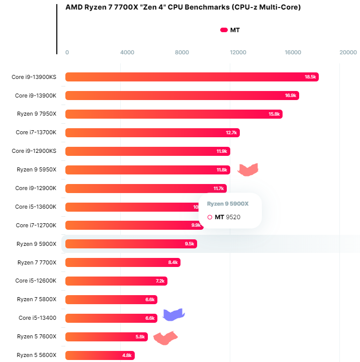 Прежде всего отметим, что Ryzen 5 7600X всё же немного быстрее Core i5-13400 в одноядерных сценариях, но происходит это исключительно за счёт более высокой тактовой частоты. А вот Ryzen 9 5950Х внезапно перестал котироваться, ведь даже скромный процессор Intel нижнего ценового сегмента обходит флагман предыдущего поколения с большим запасом. А вот в задачах, где требуется раскрыть все ядра, Ryzen 5 7600X вчистую проигрывает Core i5-13400. И вот здесь нужно сделать несколько ремарок. Во-первых, Core i9-13900K остаётся беспрекословным лидером не только в одноядерных бенчмарках, но и в многоядерных сценариях. Во-вторых, как мы уже писали выше, Core i5-13400 стоит 200 долларов, что значительно ниже самого недорогого представителя семейства Ryzen 7000. Но даже если отбросить все эти мелочи, ведь в реальных задачах с недорогой видеокартой различия стираются, то остаётся итоговая цена сборки. Ну а здесь Core i5-13400 с большим перевесом выходит вперёд.