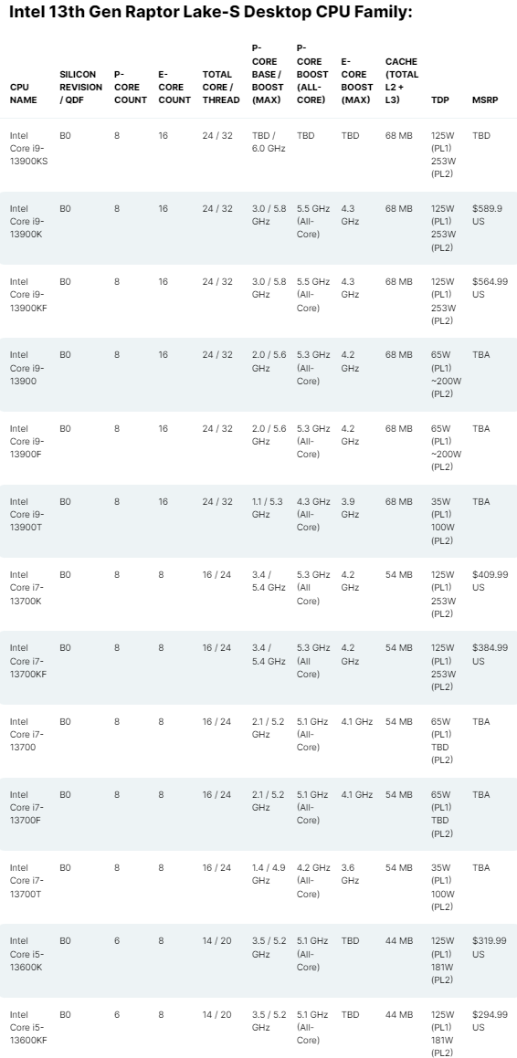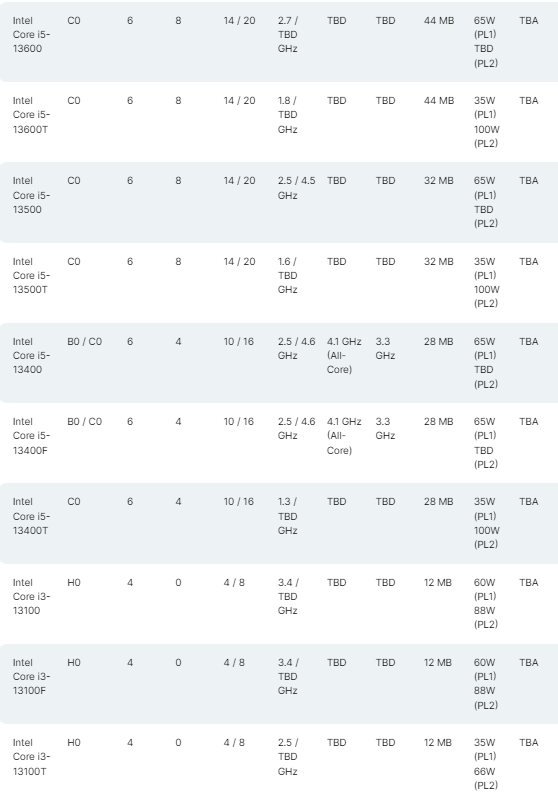 Вообще, Core i5-13400 не может считаться конкурентом для Ryzen 5 7600X поскольку последний предлагается в США от 300 долларов и выступает против Core i5-13600K. Похоже, положение у красного лагеря таково, что теперь самый бюджетный процессор синих будет во всём быстрее Ryzen 5 7600X даже несмотря на разницу в 100 долларов. В тесте CPU-Z Core i5-13400 умудрился получить 729 баллов, ну а с использованием всех ядер – 6591 балл. К результатам мы ещё вернёмся, ну а сейчас самое время слегка удивительных фактов, ведь Intel намерена превратить Core i5-13400 в настоящего игрового монстра. По данным инсайдеров, нас ждёт 6 больших и 4 малых ядра. Это значит, что камень предложит 10 ядер и 16 потоков, при этом тактовая частота первых будет достигать невероятных 4.6 ГГц. Изучить некоторые предполагаемые характеристики ещё невыпущенных процессоров Intel вы сможете в таблице ниже, ну а мы продолжим.