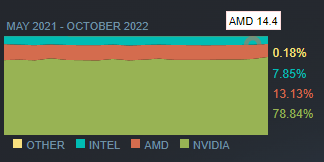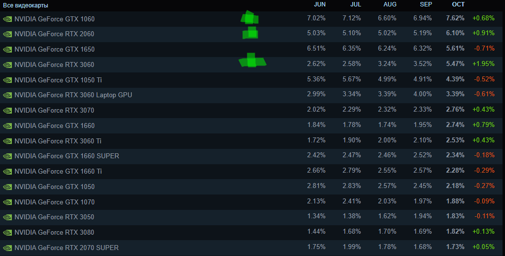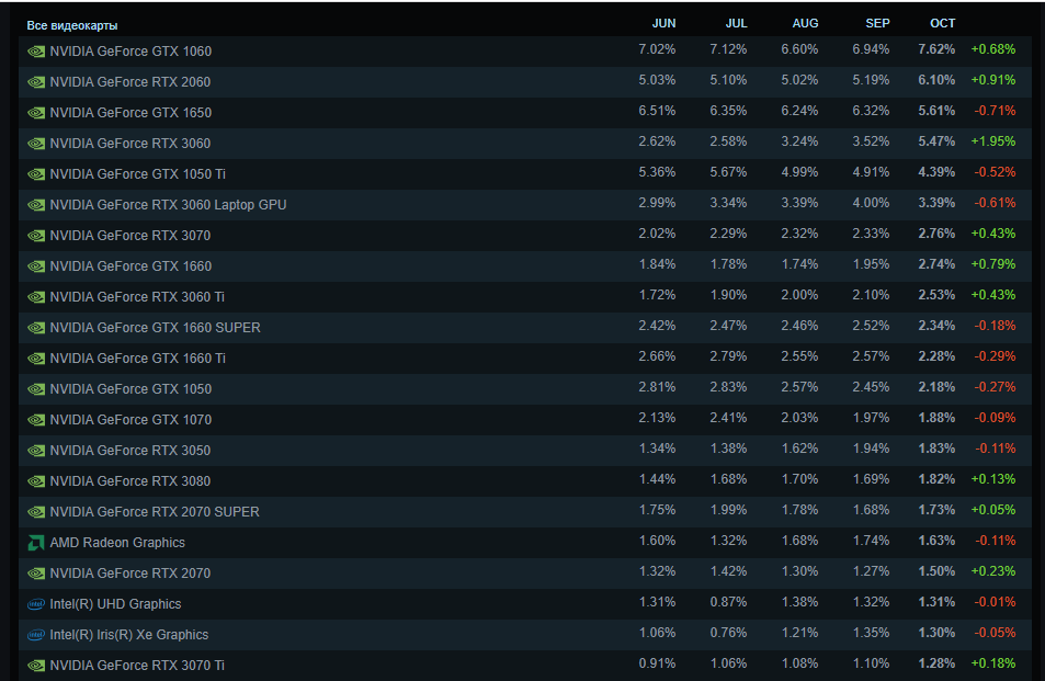 Но если всё это застывшие цифры, то у нас есть куда более интересные динамические показатели статистики Steam. Как видите, за прошедший месяц доля видеокарт AMD в сервисе снизилась больше, чем на 1%, а вот у NVIDIA дела идут отлично, ведь геймеры активно скупали графические чипы этой компании. Сегодня за зелёными почти 80% игрового настольного сегмента, что позволяет говорить, что все усилия красных не оказали никакого влияние на ценовую политику и становление рынка. Геймеры с неохотой берут решения AMD, в чем вы можете убедиться лично. Как видите, благодаря восстановлению цен на видеокарты по всему миру, наиболее популярным графическим чипом стал GeForce RTX 3060. Видеокарты на основе его пользуются бешеным спросом, а почти 2% любителей компьютерных игр решились на покупку GeForce RTX 3060 прошлым месяцем.