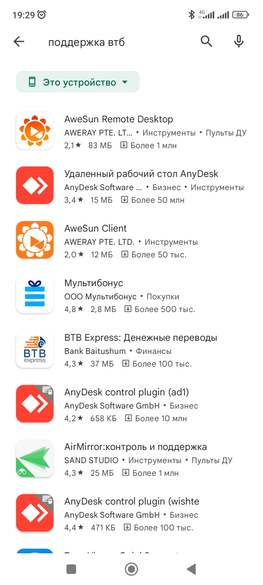 Звонившая девушка предложила автору ввести в магазине приложений для Android Google Play словосочетание «Поддержка ВТБ», что тот и сделал, после чего с удивлением обнаружил, что по такому запросу каталог выдает на первом месте приложение для удаленного управления устройством AweSun Remote Desktop. Как в дальнейшем выяснили другие пользователи в комментариях, мошенники научились продвигать приложения в топ поиска Google Play по нужным им ключевым словам и фразам с помощью фейковых отзывов, а также массовых вводов нужных словосочетаний и столь же массовых установок. Понятно, что для людей, знающих и соблюдающих основы информационной безопасности, подобная схема малоопасна, поскольку они не станут устанавливать подобный софт или предоставлять злоумышленникам нужные для управления смартфоном данные, но на далеких от мира цифровых технологий людях, например, некоторых пенсионерах, она может сработать.