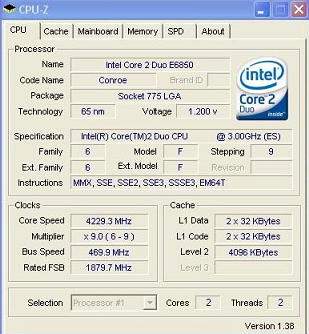 Увы, оценить разгон этого инженерного образца при воздушном охлаждении владелец процессора не пожелал. Вместо этого использовалась "фреонка", выдающая температуру 40 градусов Цельсия ниже нуля, а напряжение на ядре процессора было повышено до 1.55 В. Автор эксперимента утверждает, что материнская плата ASUS P5W64WS-Pro с BIOS ревизии 305 не смогла разогнать процессор по шине свыше 470 МГц, поэтому результирующая частота 4229 МГц для самого процессора пределом не является, просто возможности материнской платы исчерпались раньше. Этот процессор имеет не очень высокий для номинальной частоты 3.0 ГГц множитель (9x), потому что частота системной шины для него равна 333 МГц. В разгоне это станет помехой, если материнская плата не очень "сильная".