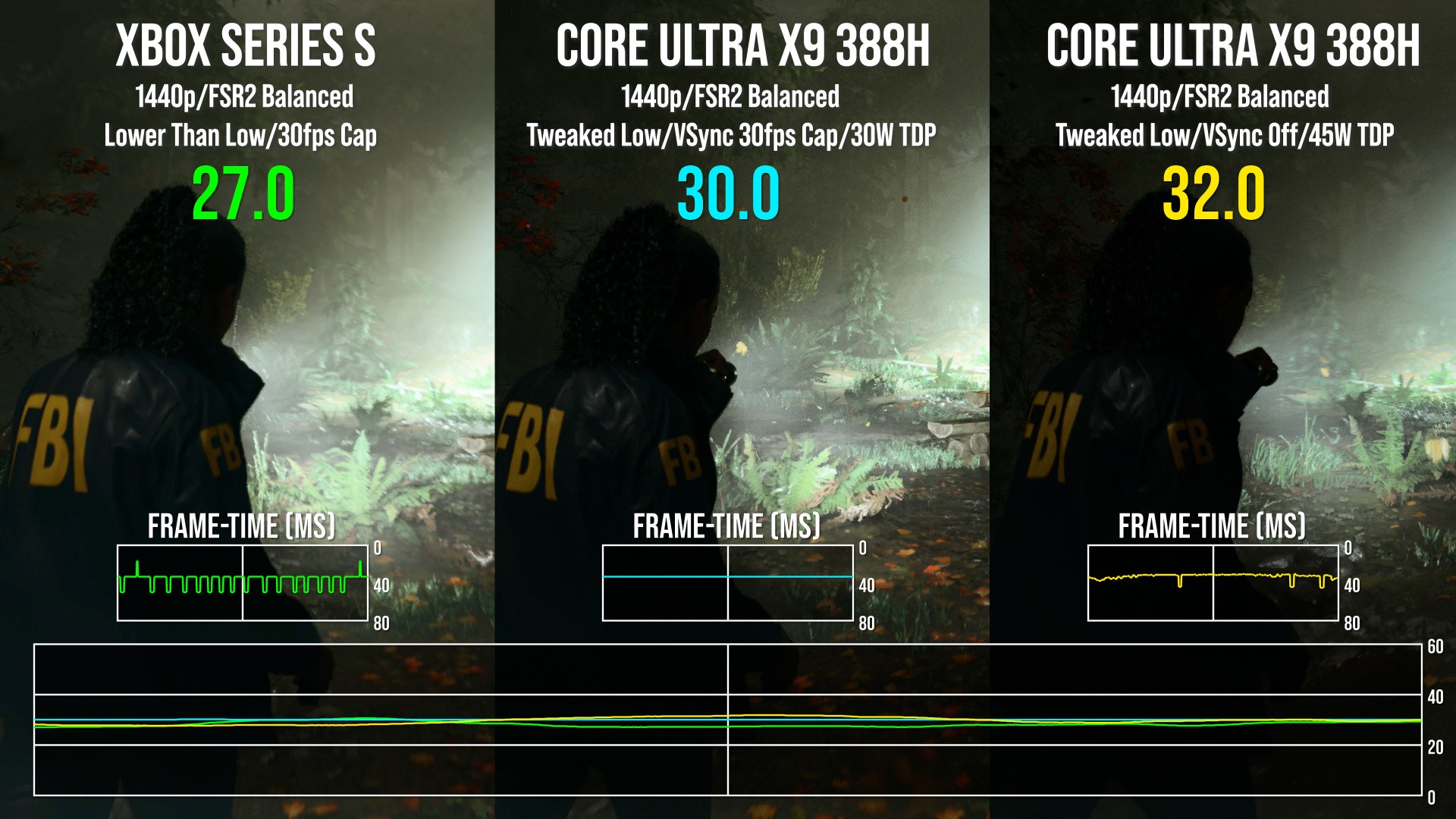 При лимите мощности процессора 30 Вт производительность ноутбука была в среднем на 7% выше, чем производительность Xbox Series S. Хотя специалисты старались выбрать эквивалентные настройки графики, у игровой консоли остаётся преимущество в виде дополнительных оптимизаций, включая автоматическое снижение уровня детализации листвы и качества теней. Несмотря на это, рассматриваемый ноутбук всё равно оказался быстрее.