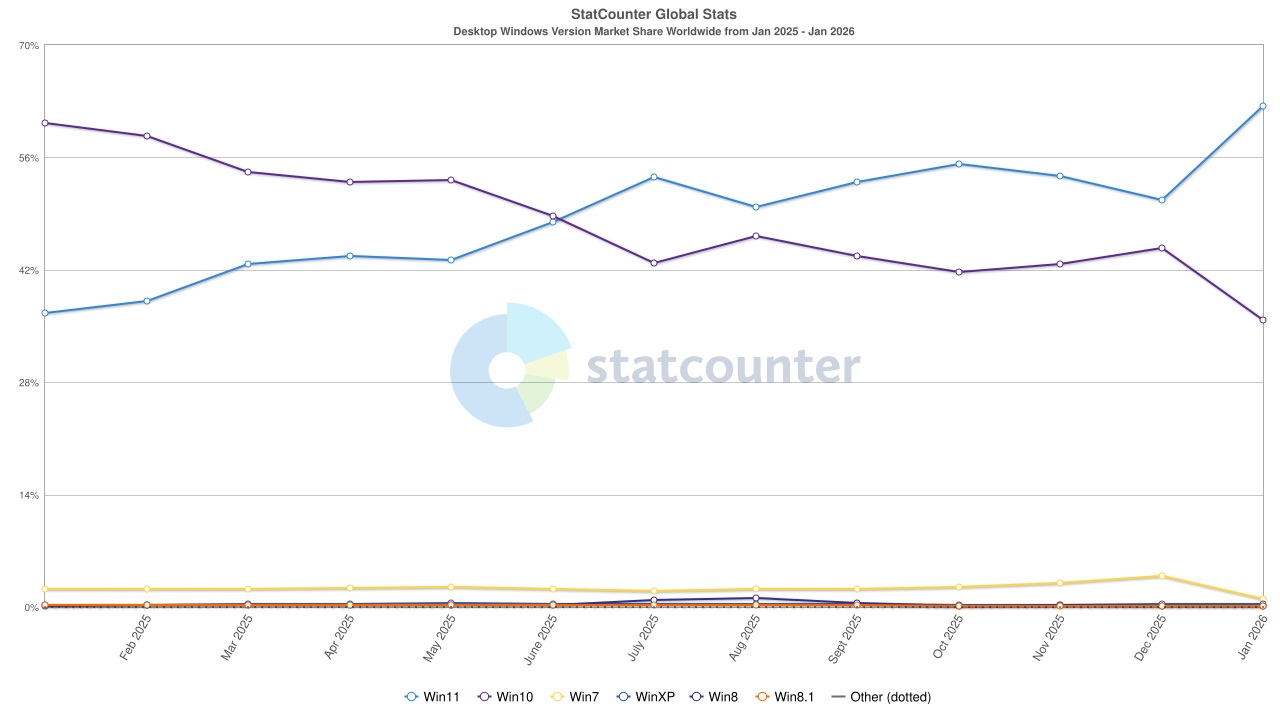 Как следует из опубликованных данных, в начале текущего года популярность Windows 10 резко упала — если в декабре 2025 года её доля составляла 44,68 %, то в январе 2026 года снизилась до 35,77 %. Windows 11, напротив, за месяц увеличила свои показатели с 50,73 до 62,41 %. На третьем месте расположилась Windows 7, которая также растеряла своих пользователей — её доля снизилась с 3,83 до 1,05 %.