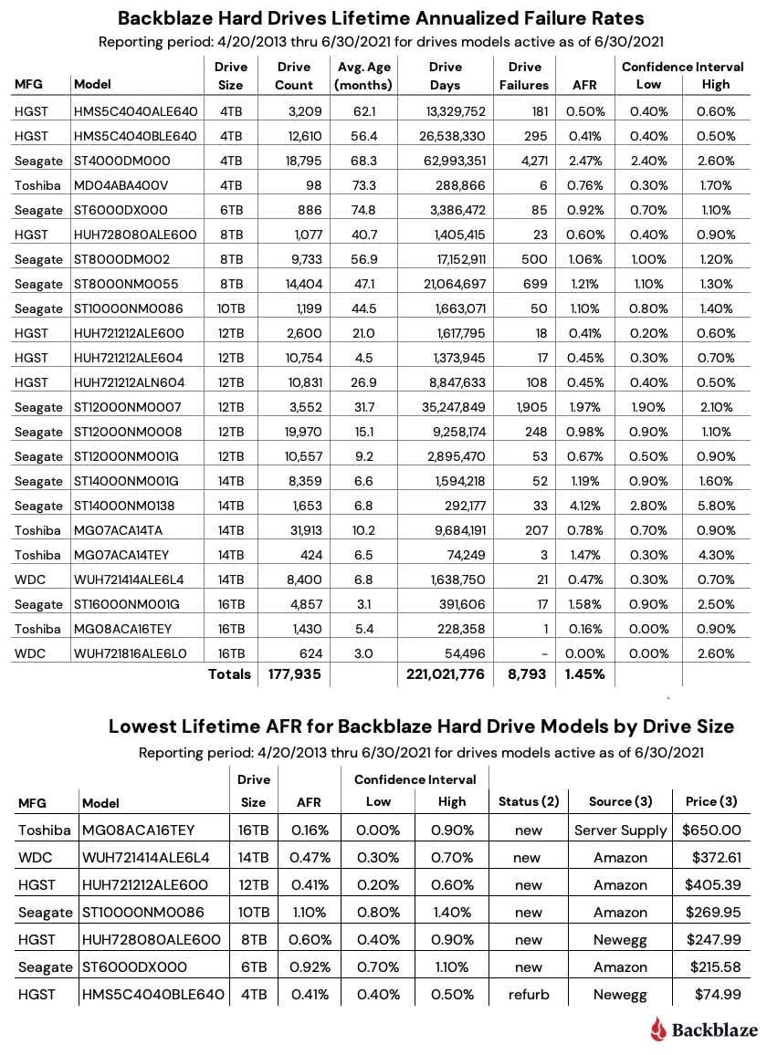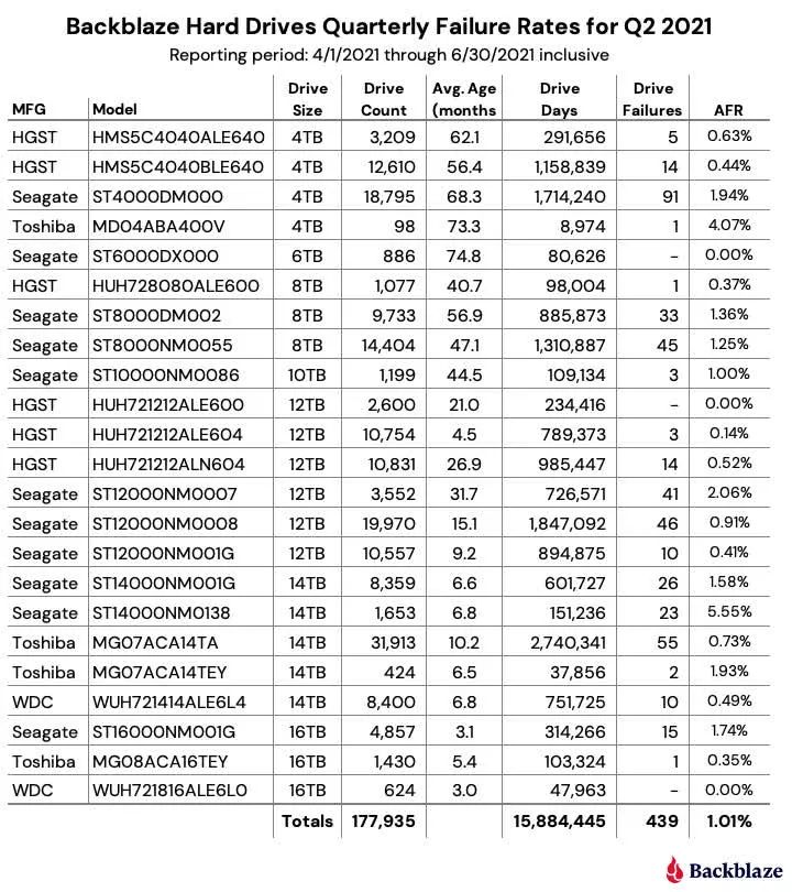 Компания Backblaze представила очередную статистику надёжности жёстких дисков с данными и загрузочных жёстких дисков и твердотельных накопителей по итогам второго квартала. Годовая интенсивность отказов (AFR) дисков с данными за квартал немного увеличилась. Возглавляли этот процесс модели Seagate и Toshiba. Этих моделей в статистике наибольшее количество и у них максимальный средний возраст. Backblaze сравнивает загрузочные HDD и SSD, стараясь проанализировать частоту отказов.