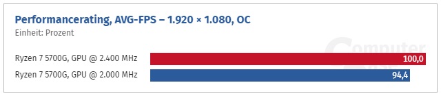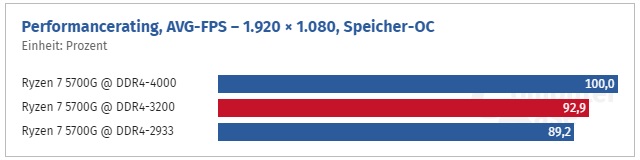 Как и ожидалось, уровень производительности встроенного видеоядра APU Ryzen 5000G зависит от частоты оперативной памяти: при использовании DDR4-2933 для Ryzen 7 5700G вместо стандартного профиля DDR4-3200 средний показатель кадровой частоты падает на 4 %, а разгон до 4000 МГц (при частоте Infinity Fabric в 2000 МГц) выигрыш составляет 8 %.