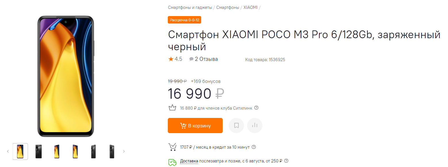 Рекомендованная производителем стоимость смартфона составила 19 990 рублей. Он оказался дороже, чем Redmi Note 10 с дисплеем AMOLED, ультра-широкоугольной камерой, но без NFC. А вот сейчас купить Xiaomi POCO M3 Pro можно со скидкой 3 000 рублей, то есть модель обойдётся в магазине «Ситилинк» в 16 990 рублей.
