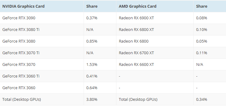 Такое отношение к геймерам не заставило себя долго ждать. Можно констатировать, что продажи видеокарт серии Radeon RX 6000 настолько низкие, что их число меньше статистической погрешности в Steam. Вообще ситуация очень странная: в майнинге новые видеокарты AMD не эффективны, а геймеры их купить не могут. Дабы не быть голословными, предлагаем взглянуть на данные, собранные экспертами. По их словам, вся серия Big Navi сегодня занимает 0.34% от всех активных видеокарт в Steam. Это откровенно удручающие показатели, ведь только одна GeForce RTX 3090 установлена на 0.37% систем.