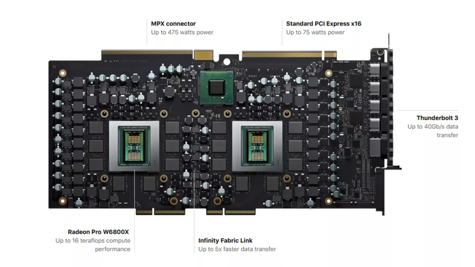 Кстати, если вы думали, что для AMD геймеры в приоритете, то сильно ошиблись. Так, графические чипы есть для игровых приставок (только PlayStation 5 выпустили 10 000 000 единиц), для автомобилей Tesla Model S Plaid, ну а теперь и для нужд Apple. Как сообщается, вскоре будет выпущена монструозная видеокарта Radeon Pro W6800X Duo, которая сможет похвастать наличием двух полноценных графических чипов на базе архитектуры RDNA 2. По сути – это две видеокарты Radeon RX 6800, за обмен данными между которыми отвечает скоростной интерфейс Infinity Fabric.