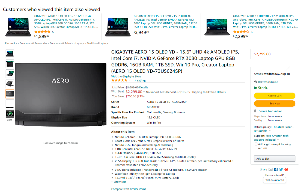 Как сообщается, сегодня на Amazon проводилась краткосрочная акция, когда у некоторых пользователей появилась возможность купить новенький ноутбук производства Gigabyte за 2299 долларов (167 000 рублей). Это 15-дюймовый Aero с видеокартой GeForce RTX 3080, которая в российских магазинах стоит больше 150 000 рублей. Получается, что всё остальное вам чуть ли не дарят. На самом деле «всё остальное» – это очень внушительная комплектация: 8-ядерный Core i7-11800H, способный разгоняться до 4.6 ГГц. 16 Гб памяти DDR4 и встроенный твердотельный накопитель на 1 Тб. 15.6-дюймовый дисплей производства Samsung выполнен по стандарту OLED и получил разрешение 4К (3840x2160). Он поддерживает огромное множество технологий, в том числе DisplayHDR 400 True Black, 100% DCI-P3 и другие. Всё это охлаждается продвинутой системой Windforce Infinity Next-gen, а компактные размеры позволяют легко взять столь мощную игровую станцию в командировку, на отдых и даже на природу, если вдруг вы не можете прожить без технологий.
