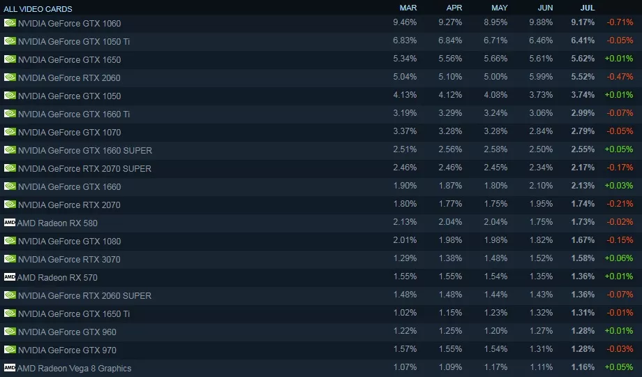 За июль наибольший рост наблюдается у мобильной видеокарты RTX 3060. Прирост среди геймеров, использующих мобильную RTX 3060, составил 0.15%. Далее за ней следовали GTX 550 Ti, у которой также прирост на 0.15% и RTX 3060 версии для ПК с приростом на 0.13%.